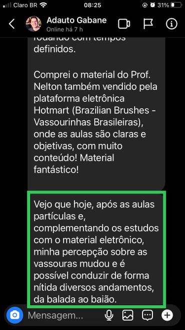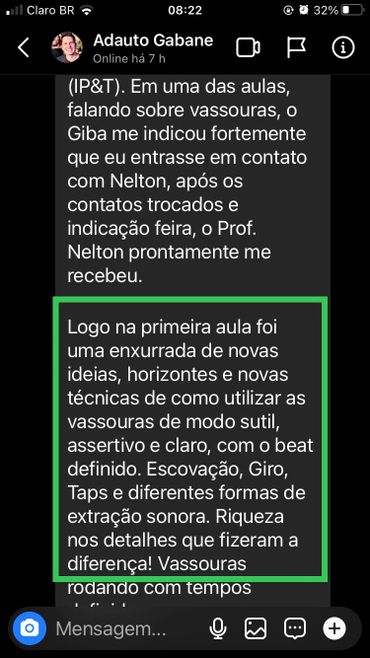 "Eu sai IMPRESSIONADO de uma Master Class do Nelton Essi na UNICAMP. Depois desse dia, fiz algumas aulas e Incorporei as vassourinhas em meus estudos e trabalhos. Ganhei muito mais versatilidade, não somente com dinâmicas, mas também com timbres e sonoridades que são exclusivos das Vassourinhas."